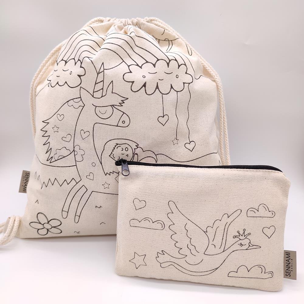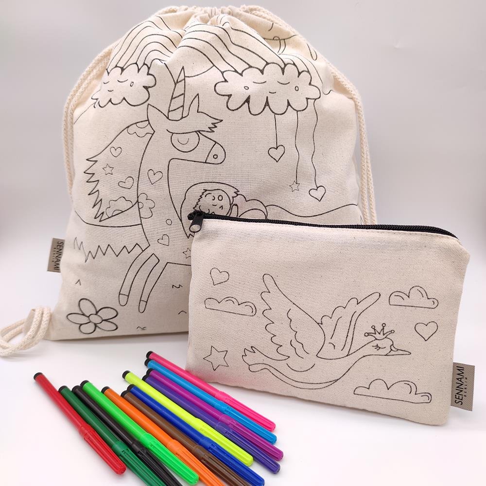 Kinder Ausmaltasche Set Turnbeutel Einhorn und Etui Tasche eleganter Vogel 100% Baumwolle Waschbar Rucksack 33×40 cm Stifttasche 20×13 cm zum Ausmalen Bemalen