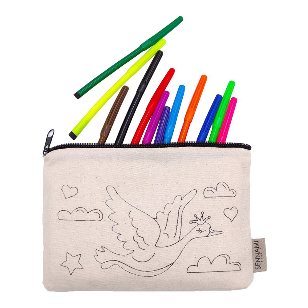 Kinder Etui Tasche zum Ausmalen 100% Baumwolle Gabardine Waschbar Stifttasche Modell eleganter Vogel Figur 20×13 cm Ausmaltasche zum Bemalen